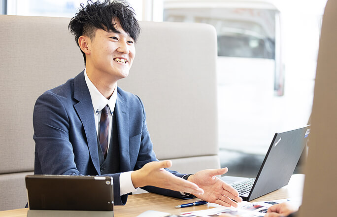 営業という仕事の醍醐味は、お客様との人間関係を築けた瞬間です。クルマは高額な商品ですので、商品を知っているだけではお客様からはご購入いただけません。クルマを知り、お客様を知り、絆を築けた時の達成感がこの仕事をしていて良かったと心から思える瞬間です。